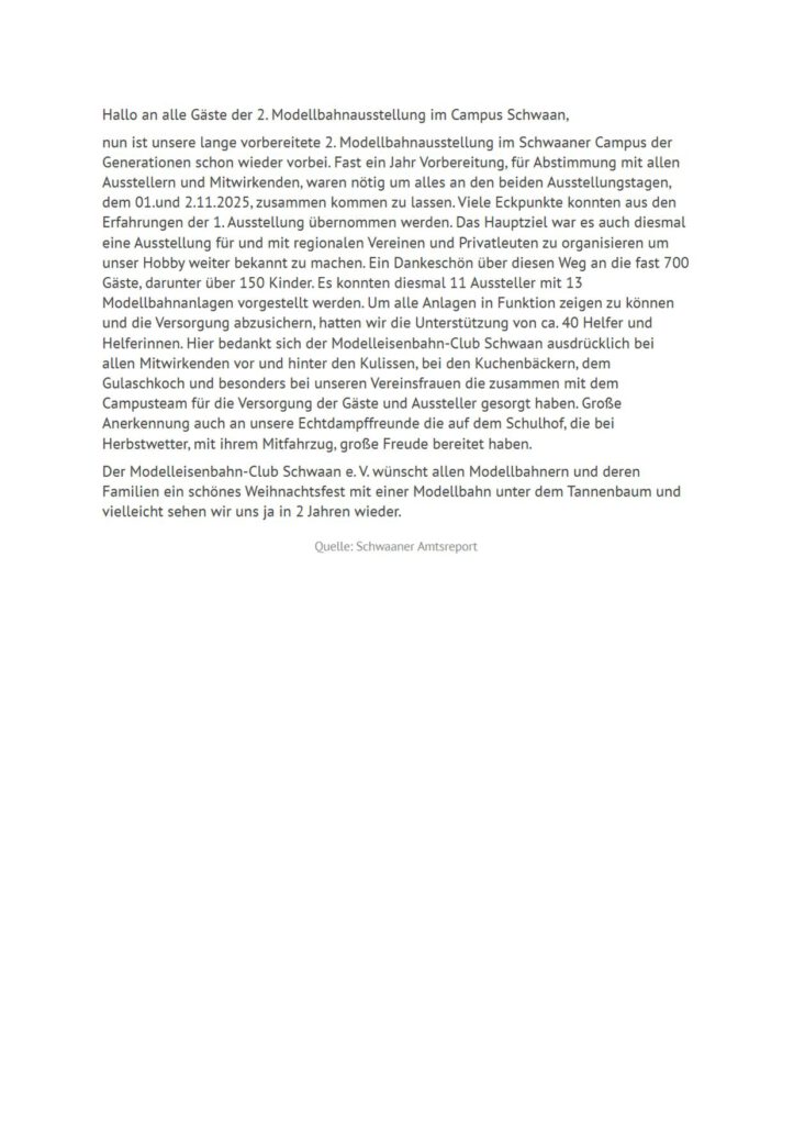 Modellbahnclub Güstrow e.V. Dies ist die Homepage des Modellbahnclubs Güstrow e.V. Aktuell: Wir waren wieder mit dabei ! 2. Modellbahnausstellung in Schwaan vom 01.-02.11.2025 im Mehrgenerationenhaus 18258 Schwaan 2. Modellbahnausstellung Schwaan_textHerunterladen